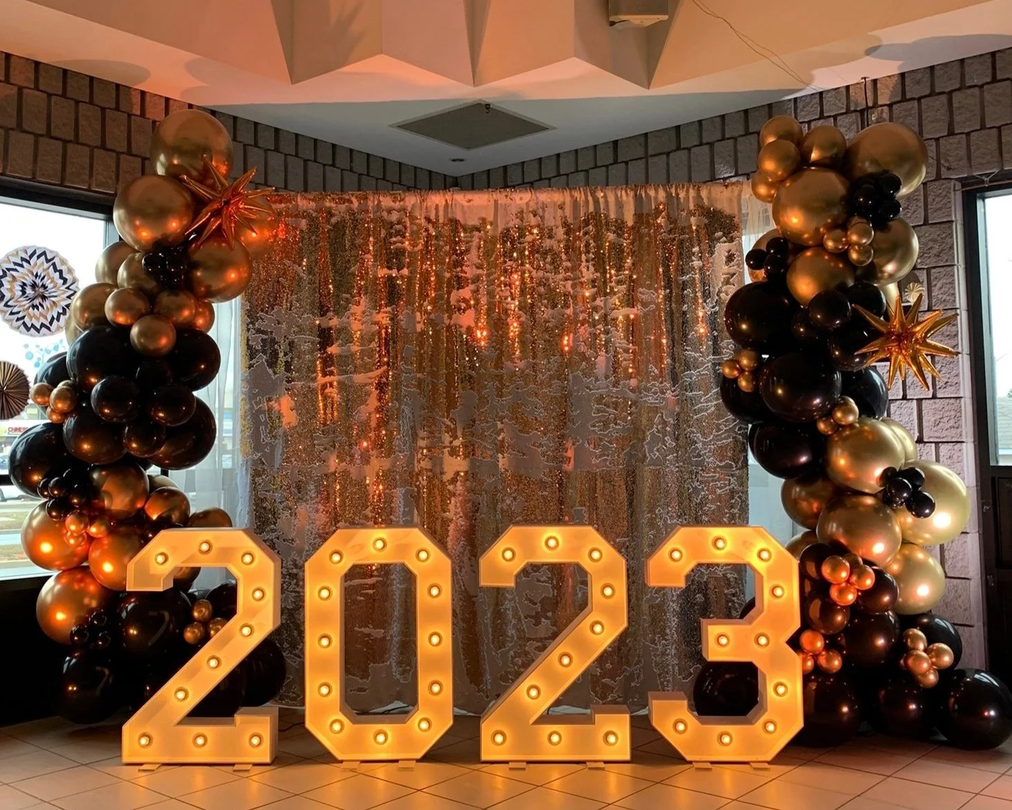 Framed by marquee letters lighting the way into 2023, guests stood against a captivating backdrop of gold and white mermaid sequins. Flanking either side, two enchanting black and gold balloon garlands add an extra touch of glamour, setting the stage for a photo-worthy celebration. This visual masterpiece was the canvas for capturing the joy, excitement, and anticipation throughout the entire night. Cheers to a picture-perfect New Year's Eve!